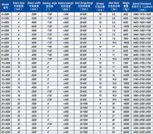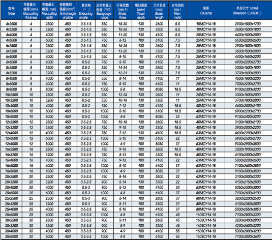 QC12Y(K) CNC Hydraulic Swing Beam Shearing Machine Technical Parameter List